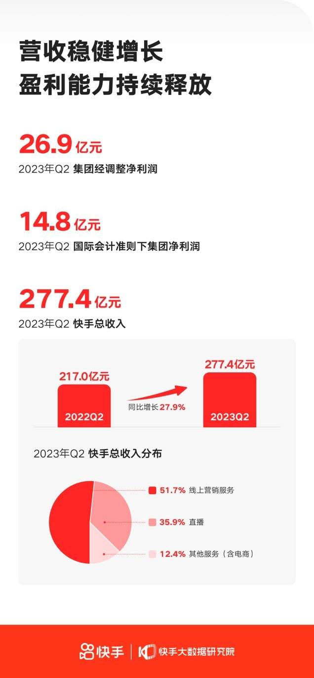 8月22日,快手科技发布2023年第二季度及中期业绩。受益于内容生态、变现策略及运营效率的持续改善,本季度,快手总营收同比增长27.9%至277.4亿元,并在上市后首次录得集团层面国际会计准则净利润,集团期内盈利14.8亿元,经调整净利润26.9亿元,远超市场一致预期。