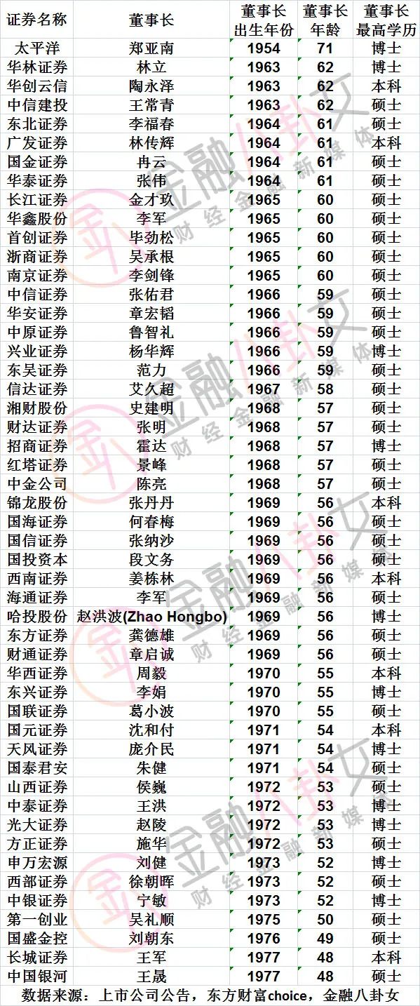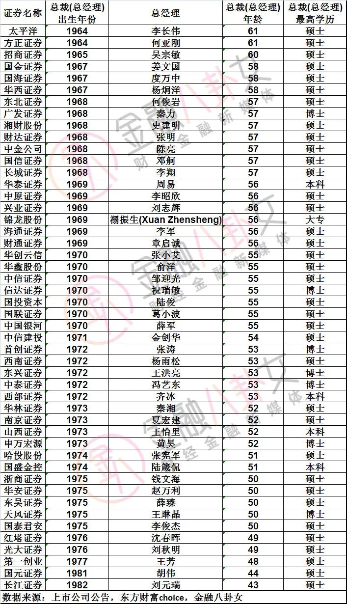 而在上市券商中,总经理就比董事长年轻不少,最大的才61岁,最小的才43岁,50岁以下的总经理就有5个。