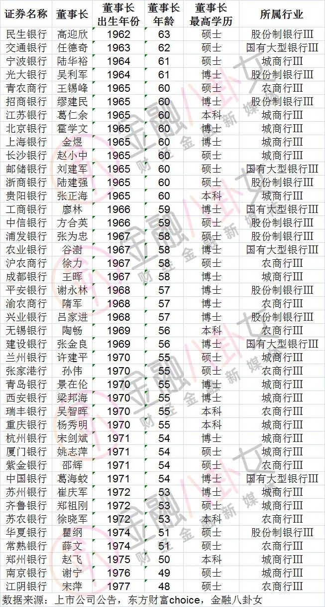 上市银行的42位董事长中,有36位年龄在50-60之间。