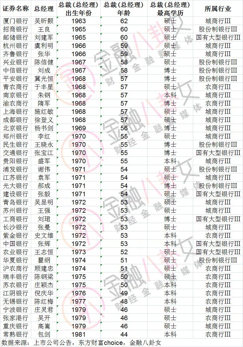 而在上市银行的39位总经理中,有32位年龄在50-60之间。6位年龄低于50岁的总经理,都是农商行和城商行的。