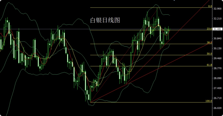 白银市场昨日继续探底,早盘开盘在31.183的位置后行情先回落,日线最低给到了30.745的位置后行情强势拉升,日线最高触及到了31.688的位置后行情整理,日线最终收线在了31.489的位置后行情以一根下影线很长的锤头形态收线,而这样的形态收尾后,日线双锤头拉升信号,短线预期延续区间震荡;综合来看,今日白银短线操作关注上方31.9一线阻力,下方关注30.3一线支撑,短期可在此区间内高沽低渣。