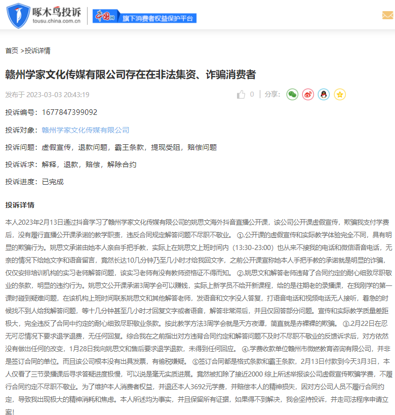 另一位投诉人称:本人于2023年2月21日提交了学习海外tiktok短视频变现的联系方式,后他们工作人员联系到我并发我他们的腾讯课堂招商课,听了他们一轮在线直播的宣传,觉得他们应该是有实力的,而且承诺30天内不满意可以退全款,于是报名参加他们的课程,签订合同,再把我拉入他们的群;群里只有我一个学员,其他都是他们公司的人,他们让我下载钉钉发视频给我,里面的视频都是些概念的讲解,没有任何实操性的东西。