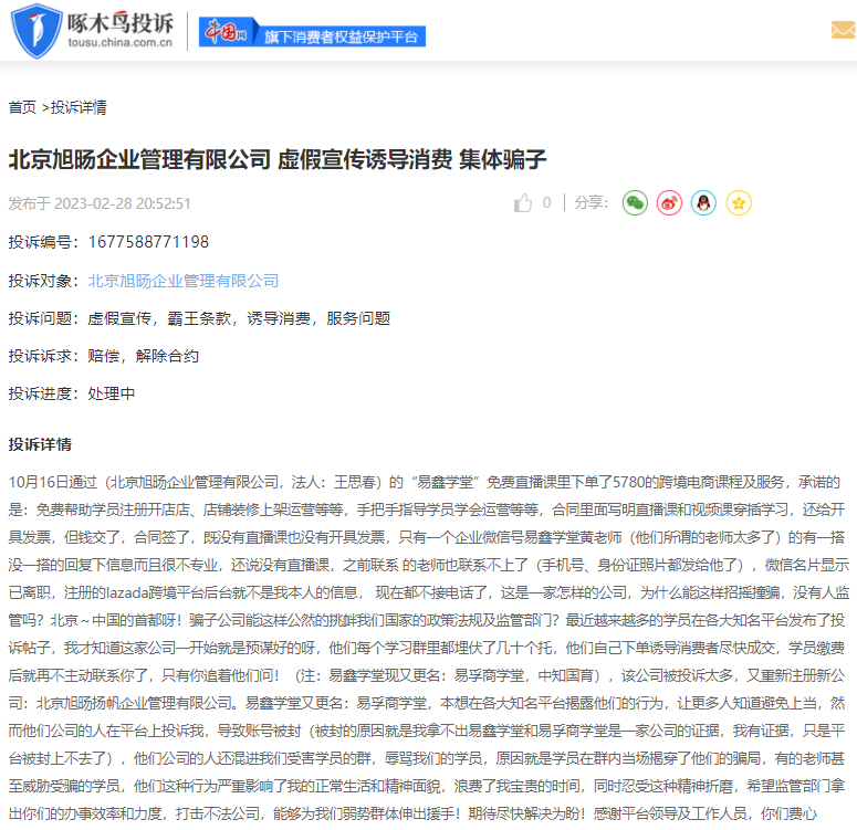 中国网旗下啄木鸟投诉平台近期接到多则所谓“跨境电商”的投诉,被投诉人为北京旭旸企业管理有限公司、编号为1677588771198的投诉显示:通过“易鑫学堂”免费直播课里下单了5780元的跨境电商课程及服务,承诺的是:免费帮助学员注册开店店、店铺装修上架运营等等、手把手指导学员学会运营等等,合同里面写明直播课和视频课穿插学习,还给开具发票,但钱交了、合同签了,既没有直播课也没有开具发票,只有一个企业微信号易鑫学堂黄老师(他们所谓的老师太多了)的有一搭没一搭的回复下信息而且很不专业,还说没有直播课,之前联系的老师也联系不上了。