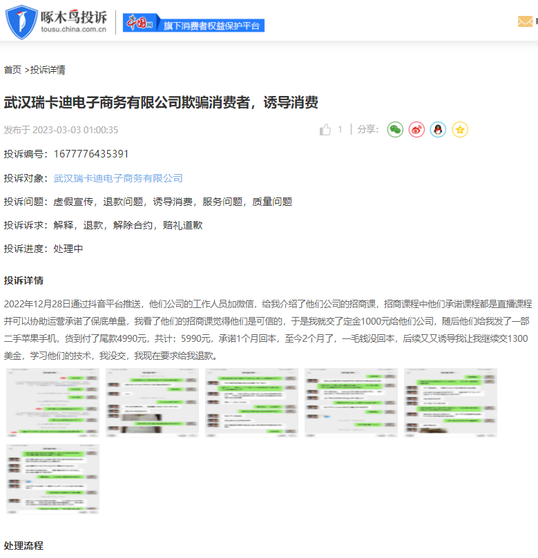 除此之外,上周涉及武汉瑞卡迪电子商务有限公司有4条投诉,内容均与所谓“直播课程”、“海外tiktok短视频变现等虚假宣传有关。