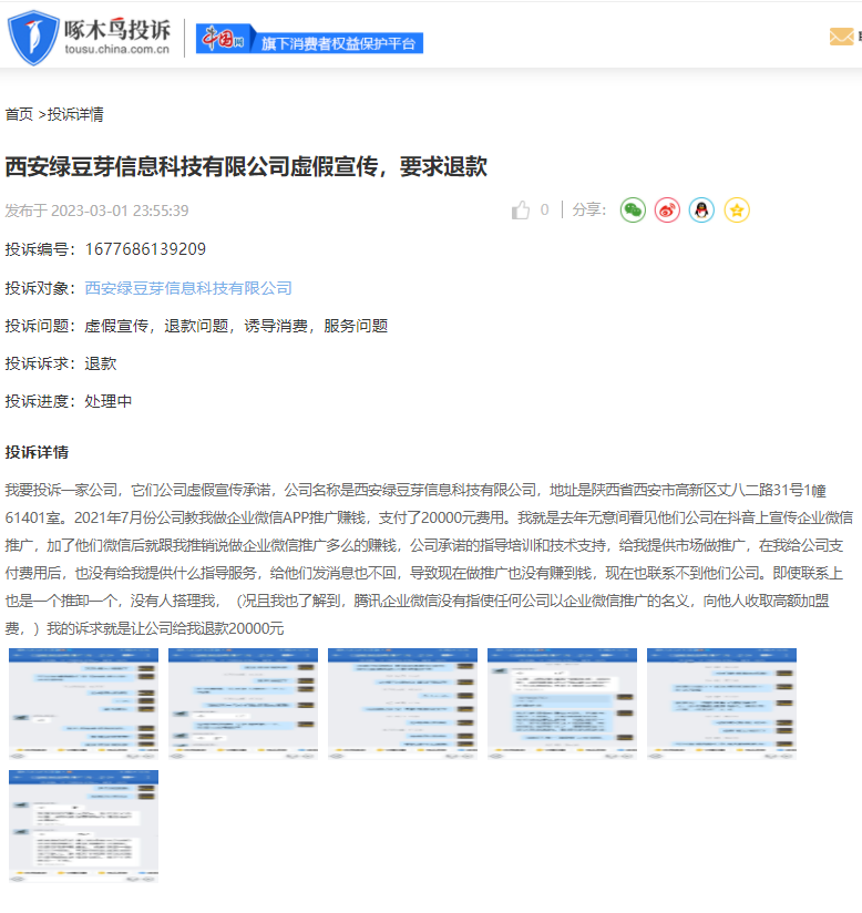 被投诉人为西安绿豆芽信息科技有限公司、编号为1677686139209的投诉显示:假宣传承诺,教我做企业微信APP推广赚钱,支付了20000元费用。承诺的指导培训和技术支持,给我提供市场做推广,在我给公司支付费用后,也没有给我提供什么指导服务,给他们发消息也不回,导致现在做推广也没有赚到钱,现在也联系不到他们公司。即使联系上也是一个推卸一个,没有人搭理我。