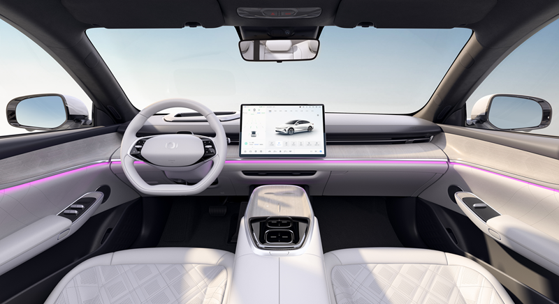 启源A07内饰同样采用了时下流行的简洁风格,大部分功能被集成在了大尺寸的中控屏内。传统的仪表盘也被AR-HUD显示所取代。换挡机构则被放置在方向盘后方,这些都与深蓝SL03异曲同工。