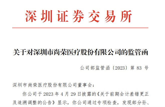 中国网财经7月7日讯(记者 张增艳)因前期会计差错更正后调整财务数据,尚荣医疗昨日晚间收到深交所发出的监管函。