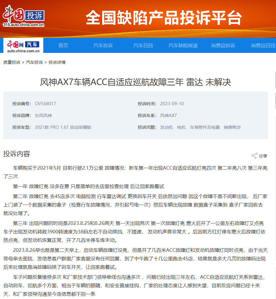 中国网汽车10月7日讯 前不久,中国投诉-全国缺陷产品投诉平台收到东风风神AX7车主舒先生关于自适应巡航系统故障和发动机故障的投诉。经过平台的沟通与协调,目前车主已与4S店达成共识,获得解决方案。