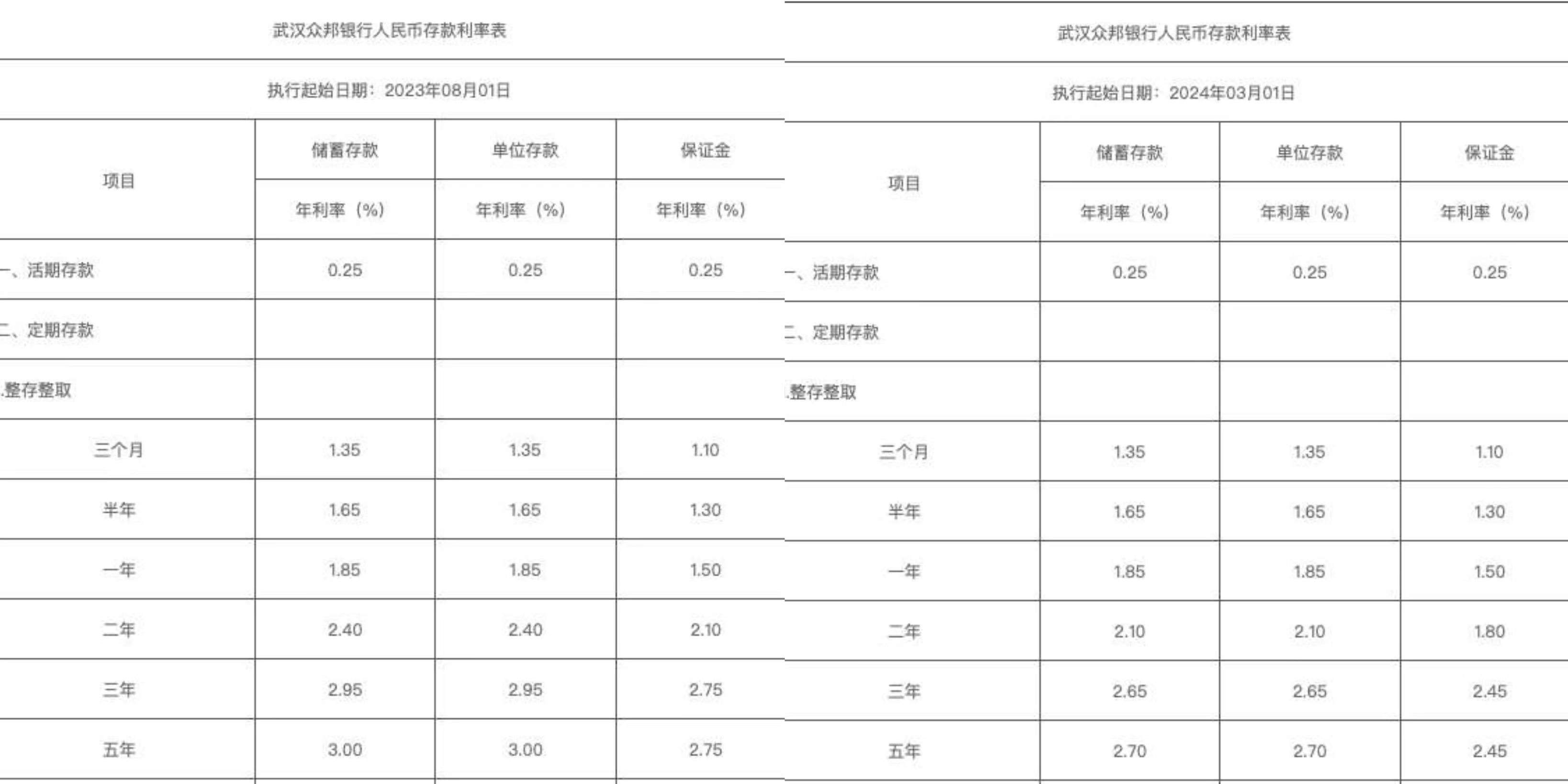 武汉众邦银行上次更新人民币存款利率表的时间是2023年8月1日,时隔半年再次更新了存款利率表,本次下调后,该行五年期整存整取存款挂牌利率告别3%。