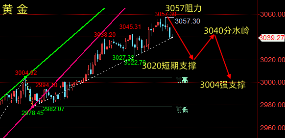 黄金价格周三上涨,美联储如市场预期般维持利率不变,但暗示今年年底前将再降息,这推动金价走强。周四亚市尾盘,金价一度升至3057美元/盎司,刷新历史高位。今日关注3040附近的支撑,是今日多空分水岭,不破继续以多头对待;反之跌破后看深度回补。短期行情不易追多,每次刷新高点后伴随着回落。4小时图表显示,技术指标从极端水平有所缓解,表明即将出现下滑趋势。此外,20周期SMA继续稳步走高,目前在3022美元/盎司左右,同时远高于较长期均线。晚间重点关注上方3057一线阻力,下方关注3022一线支撑;破位下看3005强支撑!个人建议:高空为主;GOLD分水岭:3040美元/盎司