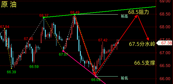 燃油库存下降和地缘政治风险为油价提供短期支撑,但OPEC+增产计划和全球经济增长放缓可能限制油价上行空间。目前技术层面仅仅处于超跌修正状态,若无法突破此前反弹高点,则延续区间震荡,等待基本面新的变化。技术面上看,昨日国际油价先抑后扬,亚欧盘先是小幅回踩下探,刺破66关口后迎来企稳回升,晚间美盘油价连续反弹回升,到达67关口上方收盘,日K线报收震荡回升修复中阳。日线图级别,油价走势依旧压制运行于10日均线及20日均线下方,晚间油价短线关注上方68.5附近压力,下方关注66.5一线支撑。个人建议:低多为主;WTI分水岭:67.5美元/桶