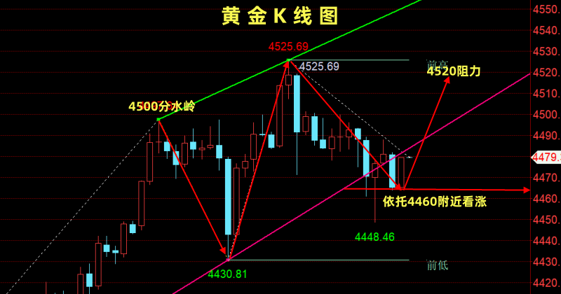 技术面:金价虽周三收取震荡见顶形态,暗示短期反弹有回落走低风险,但走势处于近期回升趋势之中,下方有众多均线支撑,故此,如有回撤调整,下方关注各均线支撑位置,也是入场看涨机会。日图上看收一根具有长下等长的影线,虽然多头依然保持着良好的上升趋势,但上升的力度已经有一定的减弱,可能会重新进入短暂的震荡蓄力,随后直接上攻高点。而从一小时看,依然保持着良好的上升趋势,前高前低共同抬升,昨日突破了阶段性4525阻力后连阴走弱,但趋势上多头仍是主调。所以耐心等待回落低位进行顺趋势博弈才是稳妥的做法,而下方支撑4460的低点就是开盘二次看涨的关键点。开盘重点关注上方4520-4550美元一线压力,下方关注4460-4440美元一线支撑。个人预计:低多为主,高空为辅。GOLD分水岭:4500美元/盎司!