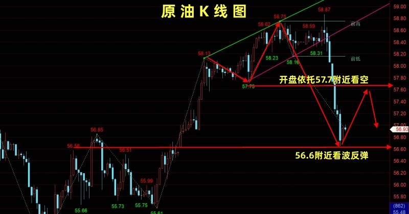 多单:激进56.5±0.2区间,稳健55.6±0.2区间,止损:各0.6左右,目标位:57.7附近!