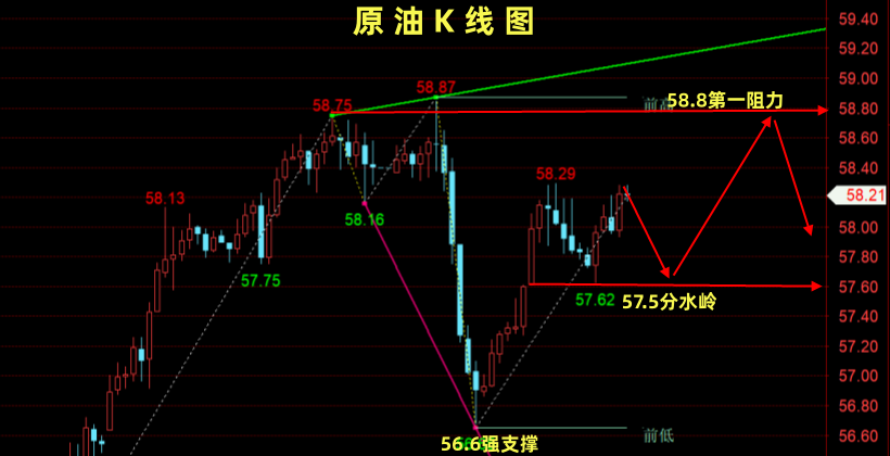 多单:激进57.5±0.2区间,稳健56.6±0.2区间,止损:各0.6左右,目标位:58.8附近!