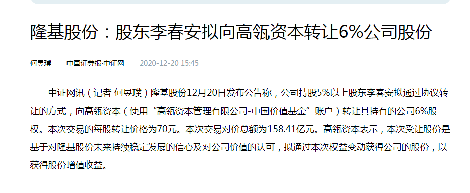 另外,高领以70的价格,转让隆基股份6%的股权,价值158亿,今天隆基股份直接涨停。大伙可以想想,隆基股份今年涨了3倍,高领在涨3倍的情况下花158亿去买,可见顶级资本对优质股权的饥渴程度。林园说过:怕高的都是苦命人,还是有一定道理的。(前提是优质公司)