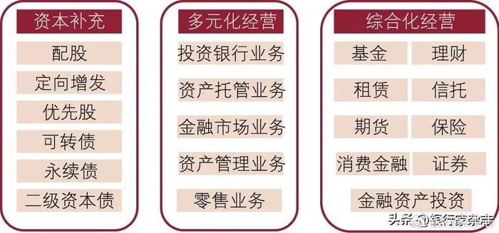 三是集团母子联动开展综合化经营。商业银行综合化经营,是指商业银行在传统存贷业务及中间业务之外,为更好地满足客户需求,以子公司形式经营基金、理财、租赁、信托、期货、金融资产投资、保险、消费金融和证券等非银行业务。商业银行强化综合化经营能力,以自身有限的资金、资本撬动更多金融资源,能够丰富补充业务品种,带动拓展更大业务空间。