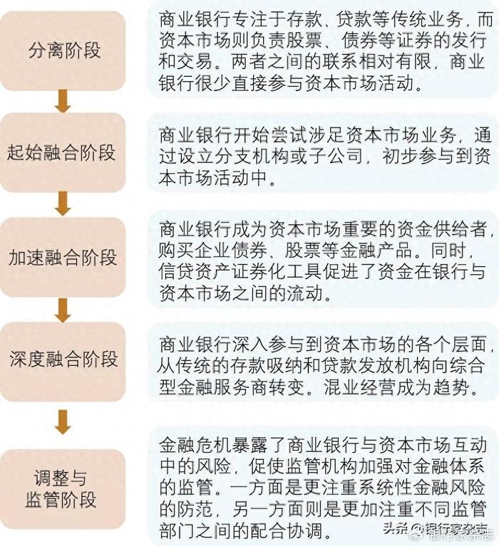 国际经验表明,直接融资的快速发展不仅促进了金融创新和市场竞争,还推动了商业银行与资本市场的深度融合(见图1)。在金融市场一体化趋势的推动下,欧美各国纷纷放松金融管制,金融创新不断涌现。大型银行集团借助资本市场开拓新的收入来源,在资本市场的发展和壮大过程中发挥了重要作用。银行和资本市场从分离逐渐走向融合,成为国际金融业的主流趋势。这种融合有助于增强本国金融体系的国际竞争力,提高资源配置效率。商业银行与资本市场的融合带来了诸多机遇,但也会带来风险与挑战,要求各国监管机构根据本国金融市场的特点制定合适的监管政策,以引导金融体系的健康发展。
