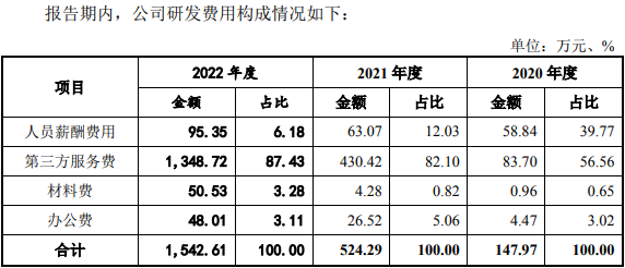 值得注意的是,在研发费用构成中,第三方服务费用占比最大且逐年增长,2020年至2022年分别为83.7万元、430.42万元及1348.72万元,占研发费用的比例分别为56.56%、82.1%、87.43%。