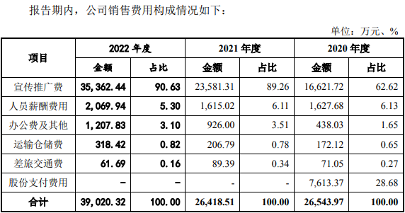 另一方面,敷尔佳销售费用快速增长,2020年至2022年分别为2.65亿元、2.64亿元、3.9亿元,占营业收入的比例分别为16.75%、16.01%、22.06%;这其中,宣传推广费占比最大且逐年增长,分别为1.66亿元、2.36亿元、3.54亿元,占销售费用的比例分别为62.62%、89.26%、90.63%。