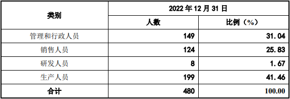 2022年期末,公司研发人员增至8人,占员工总数的1.67%。相较之下,公司销售人员2022年末达到124人,占员工总数的25.83%,较2021年末增长了24人。