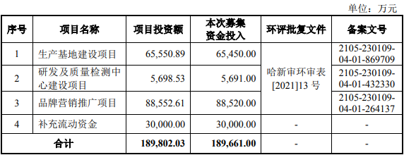 招股书显示,敷尔佳此次IPO拟募集资金189661万元用于生产基地建设项目、研发及质量检测中心建设项目、品牌营销推广项目的投资建设以及补充流动资金。其中,品牌营销推广项目的拟投入募集资金最多,为88520万元,占总募集资金的46.67%;相比之下,研发及质量检测中心建设项目的拟投入募集资金仅为5691万元,占总募集资金的3%。