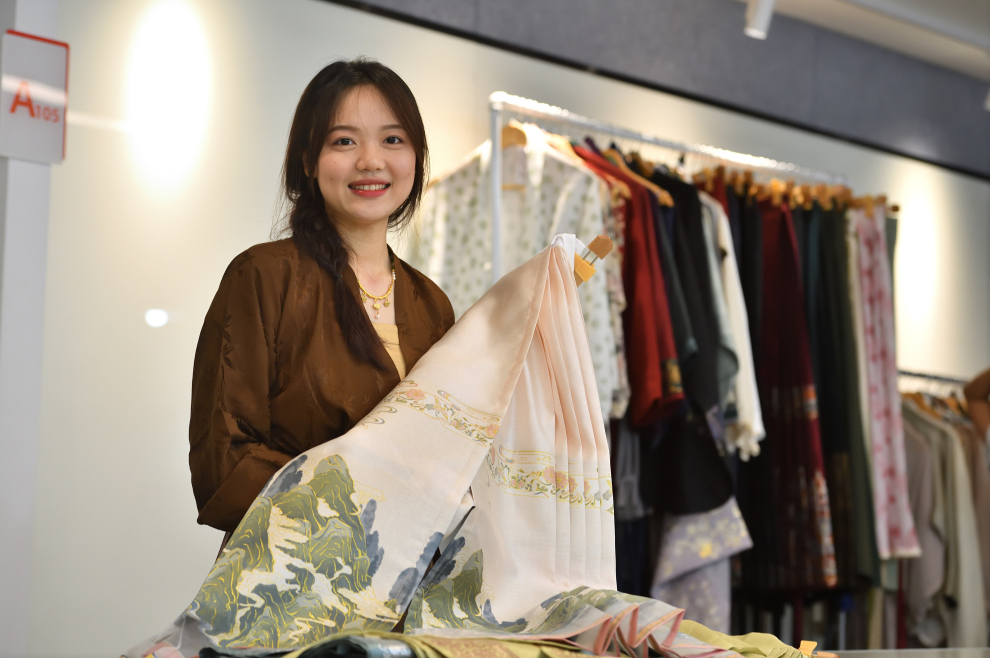 他进一步表示,设计风格上,织造司的设计团队会参照传统文物,将纹样二次创作,并结合时装的方向,创新产品;功能点上,团队通过改良面料,还有压褶工艺,使马面裙可以直接机洗,不易散褶。