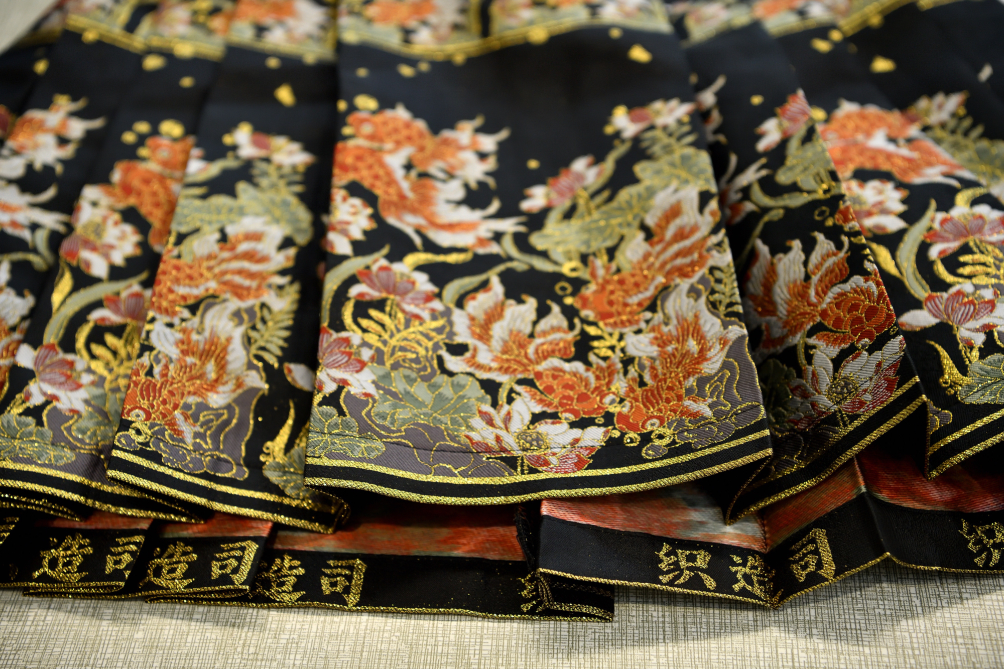 这款马面裙,采用的是南京云锦织造工艺。南京云锦,被誉为中国古代织锦技术的巅峰,2009年曾入选联合国《人类非物质文化遗产代表作名录》。因为其用料考究且工艺复杂,素有“寸锦寸金”之称。