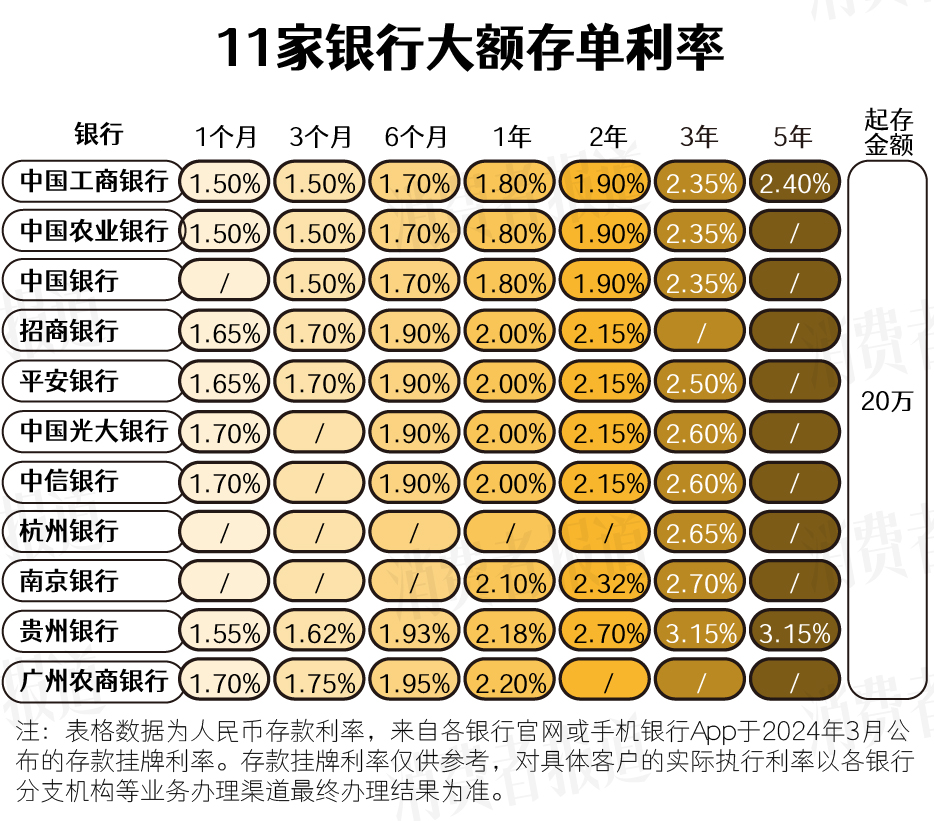 《消费者报道》记者于2024年3月查询和统计了25家银行的存款利率,供消费者参考。