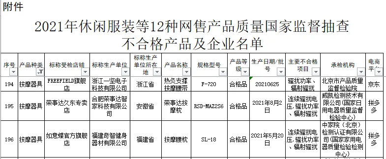 诸多品牌被检出不合格情况,包括标称商标为南极人、361°、荣事达、APTONI的按摩器具。