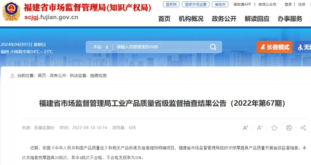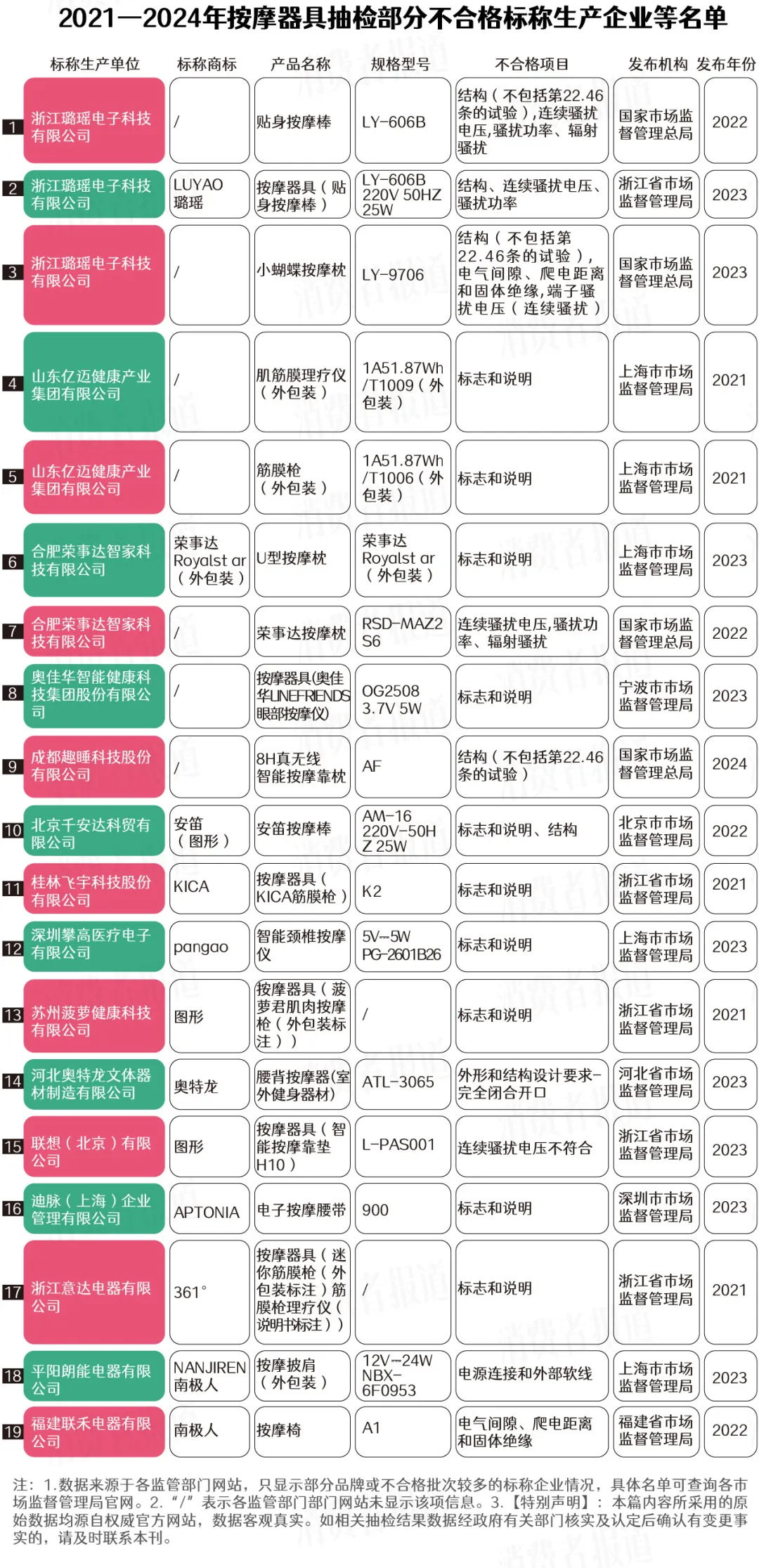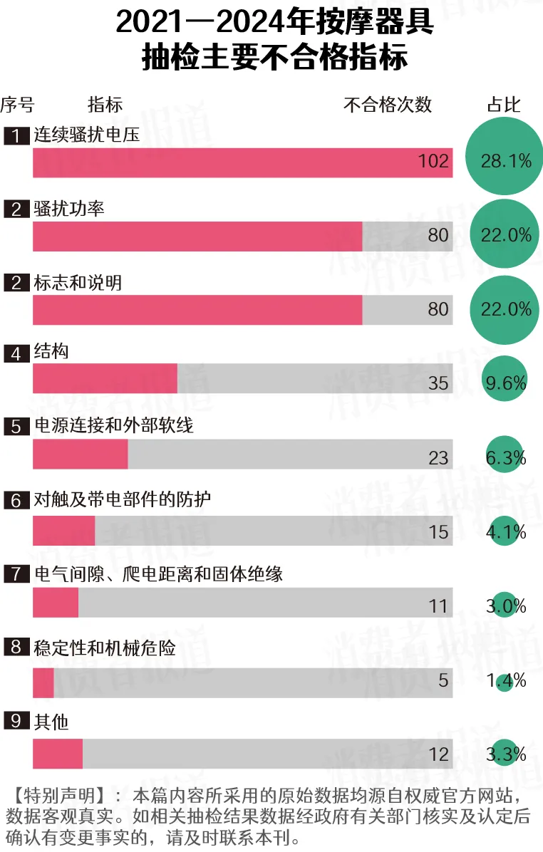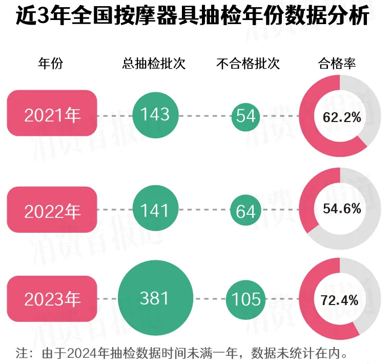 2024年4月,《消费者报道》整理了国家市场监督管理总局及省市级市场监督管理局于2021-2024年发布的按摩器具的抽检数据,分析数据得出对消费者有用的结论。