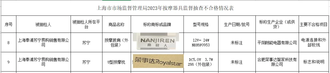 2023年6月,上海市市场监督管理局发布按摩器具监督抽查情况,1批次标称由“合肥荣事达智家科技有限公司”生产的“荣事达Royalstar(外包装)” U型按摩枕不合格,主要不合格项目为标志和说明。