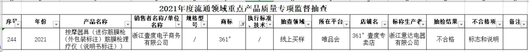 2021年12月,浙江省市场监督管理局发布流通领域重点产品质量专项监督抽查情况的通报,1批次标称由“浙江意达电器有限公司”生产的“361°”按摩器具(迷你筋膜枪(外包装标注)筋膜枪理疗仪(说明书标注))不合格,不合格项目为标志和说明。