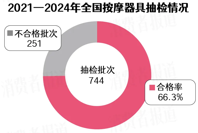 按摩器具作为消费者投诉、举报集中及质量问题较多的产品,近些年是监管部门的监管重点。结果显示,3年多来(2021年1月至2024年3月),国家市场监督管理总局及省市级市场监督管理局共抽检按摩器具产品744批次,其中251批次不合格,合格率为66.3%。