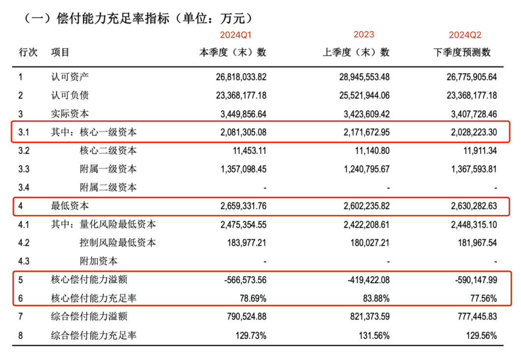 根据原保监会的《保险公司偿付能力监管规则》(以下简称“偿二代”),保险公司应满足核心偿付能力充足率大于50%、综合偿付能力充足率大于100%。偿付能力充足率=实际偿付能力额度/最低偿付能力额度=实际资本/最低资本。从国华人寿2023年末和2024年第一季度的数据看,国华人寿核心偿付能力充足率和综合偿付能力充足率始终满足监管要求。
