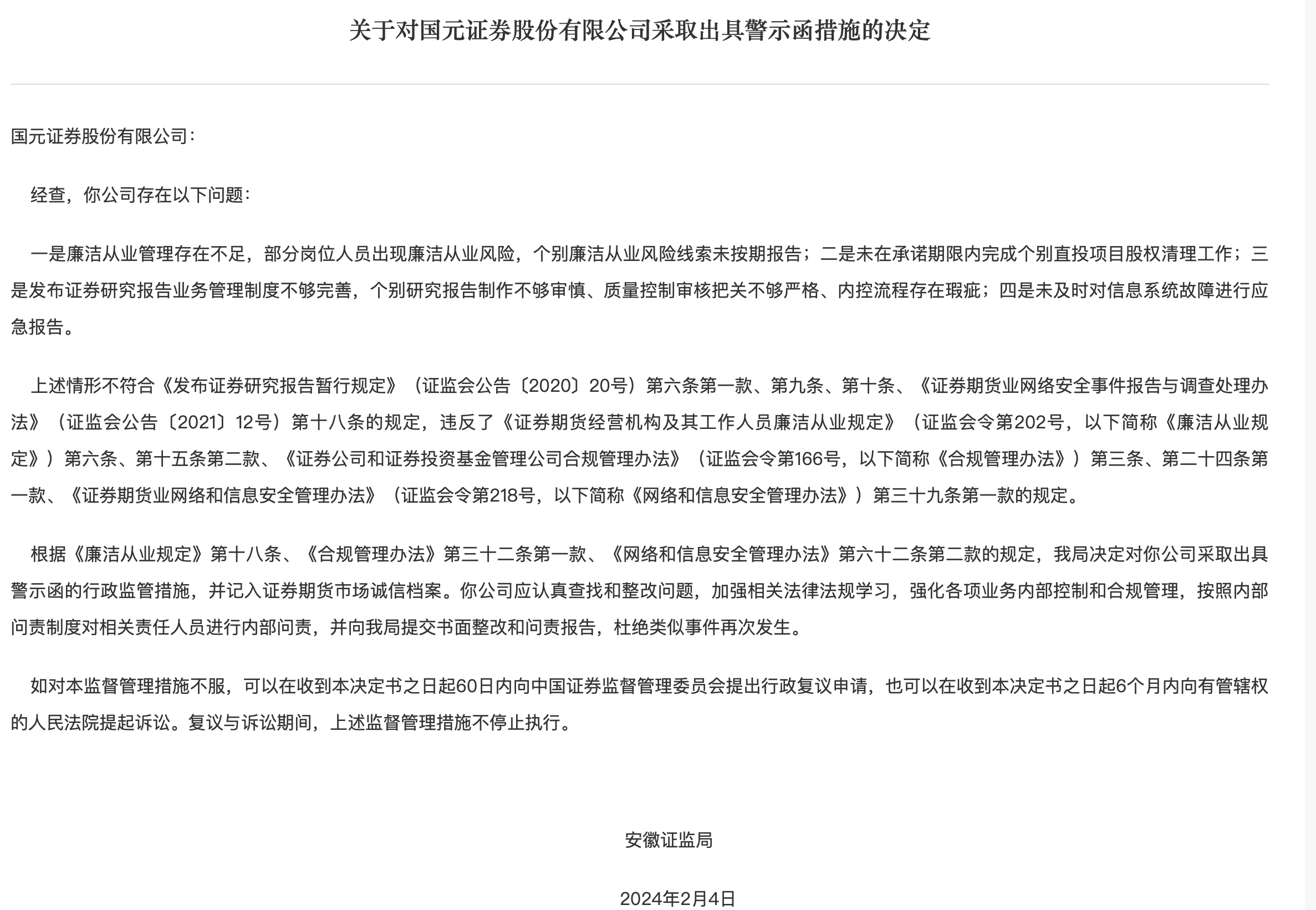 今年2月,安徽证监局曾对国元证券出具警示函,其中曾指出国元证券存在廉洁从业管理存在不足、部分岗位人员出现廉洁从业风险,个别廉洁从业风险线索未按期报告;未在承诺期限内完成个别直投项目股权清理工作;发布证券研究报告业务管理制度不够完善,个别研究报告制作不够审慎、质量控制审核把关不够严格、内控流程存在瑕疵;未及时对信息系统故障进行应急报告等问题。