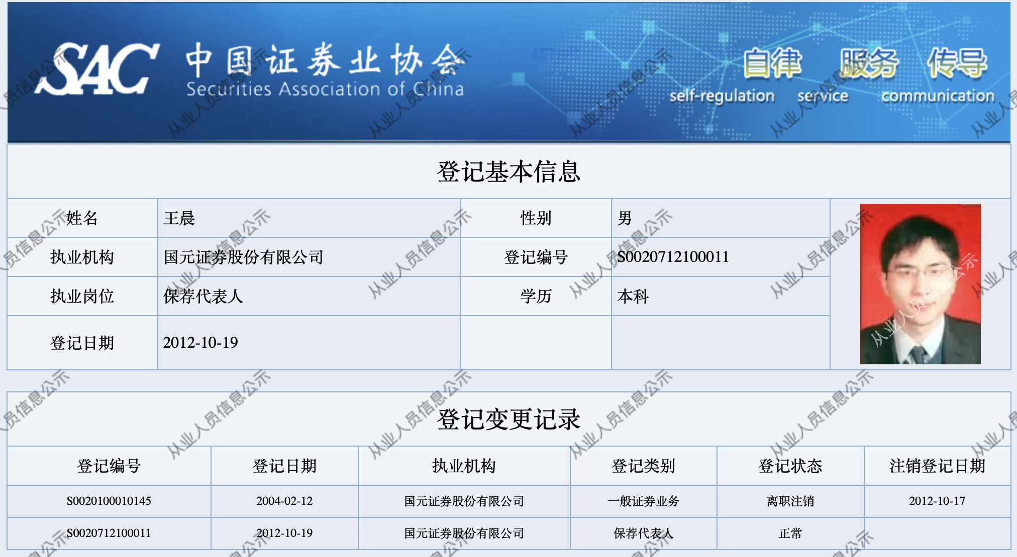 据中国证券业协会公开信息,王晨自2004年2月起入职国元证券,2012年起登记为保荐代表人,目前尚无离职注销信息。