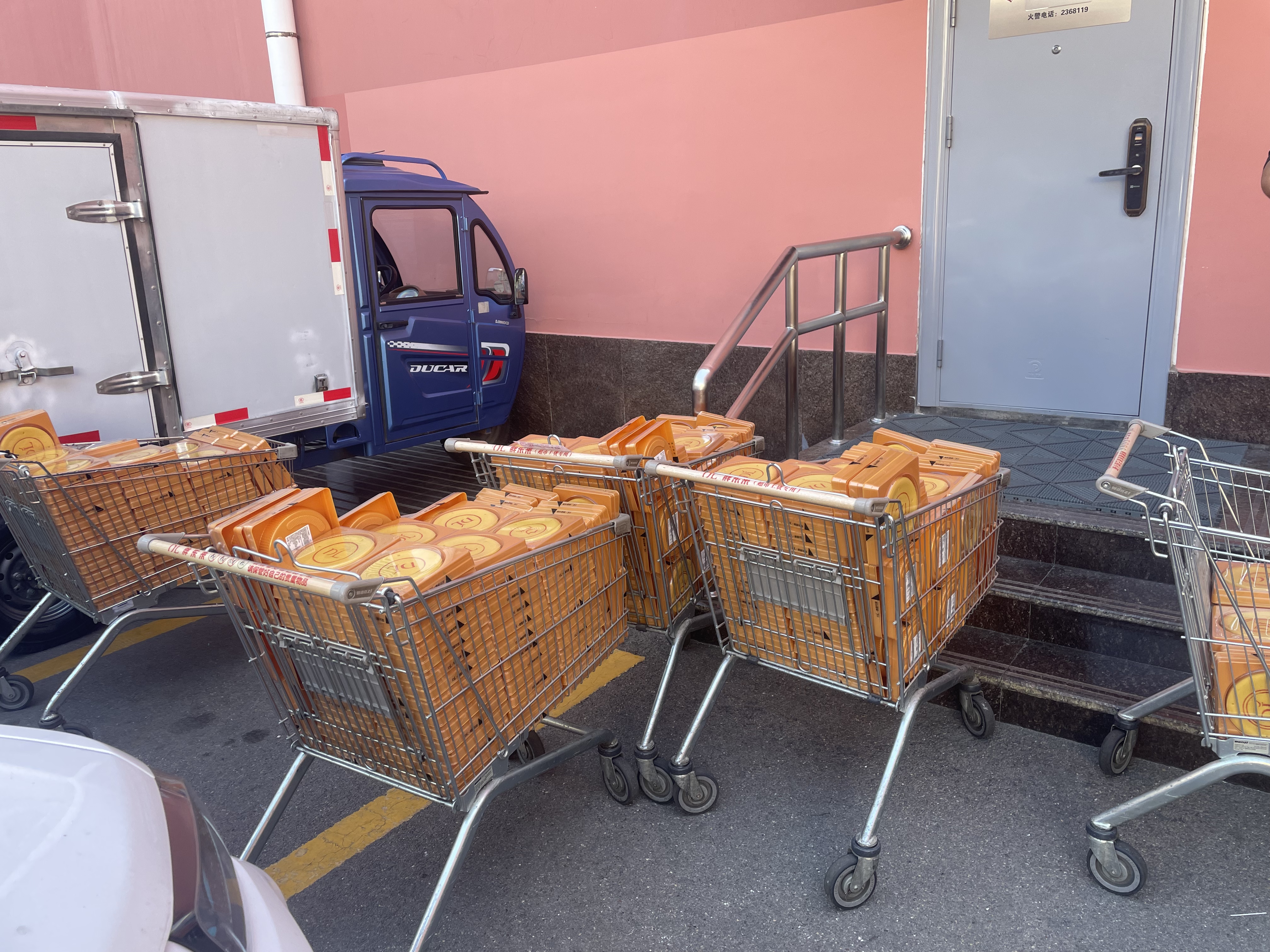 在胖东来附近的停车棚,几家物流公司的快递员早候在那里。根据几位快递员的说法,早上9点半到晚上8点,他们都在持续收件,三轮快递车起码走三四趟,才能把一天的货载到发货点。