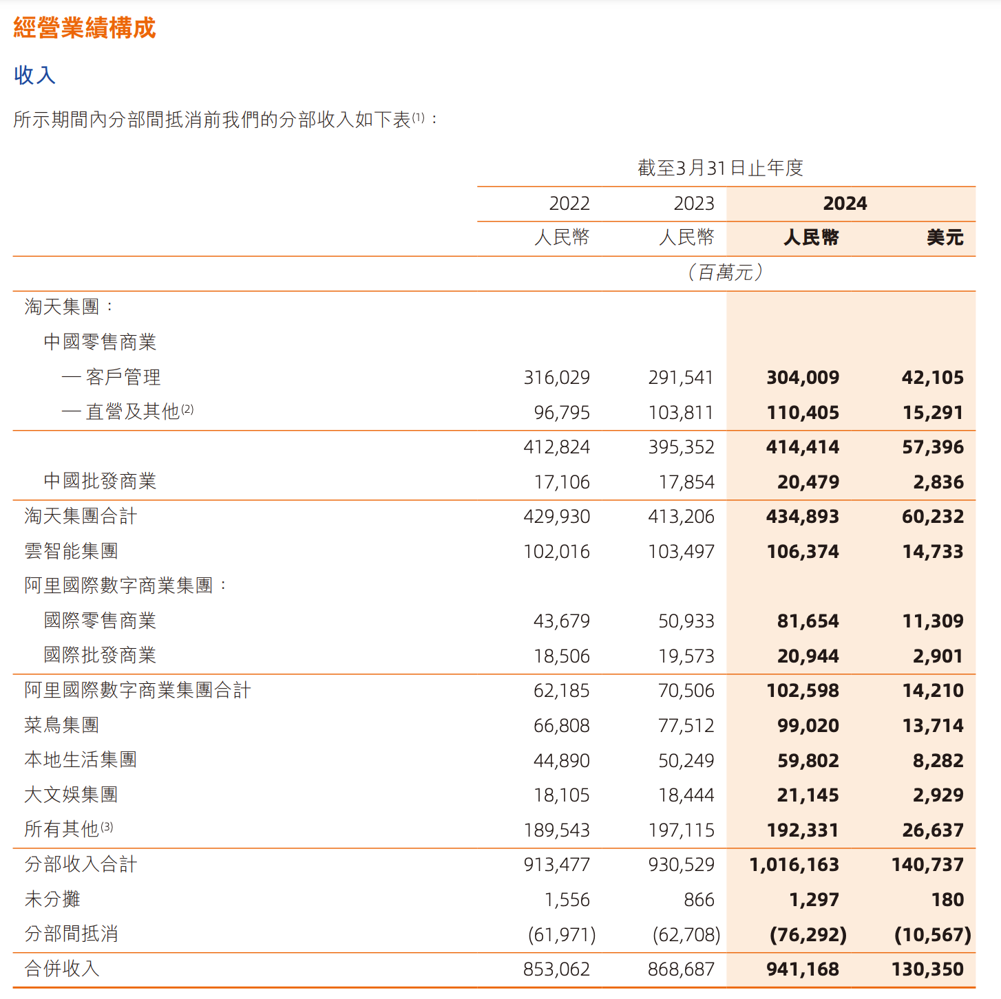 (阿里巴巴业务收入数据,图源:阿里巴巴财报)