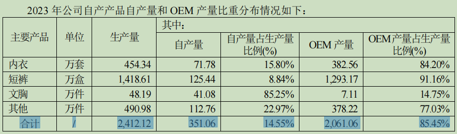 短裤的OEM量2021年-2023年占比也是极高,分别是93.22%、88.84%、91.16%。2023年,浪莎股份的内衣、短裤、文胸和其他产品总产量是2412.12万套/件,其中OEM的产量是2061.06万套/件,占比85.45%;自产351.06万套/件,占比14.55%。不过年报中并没有单独披露一次性内裤的信息和数据。
