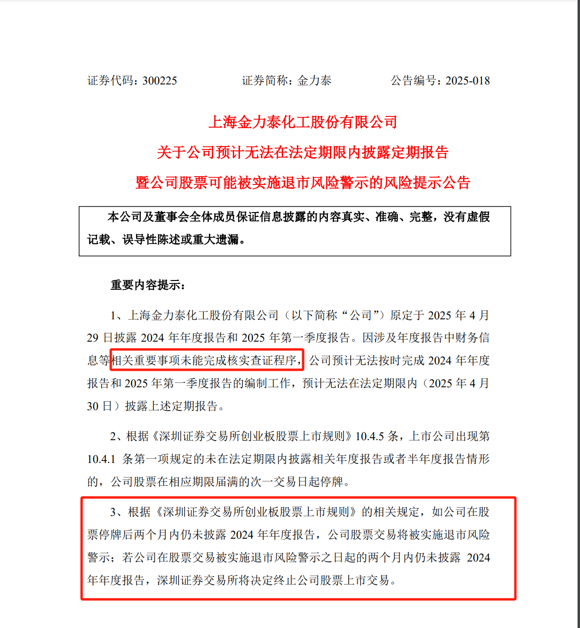 4月23日晚间,金力泰公告,公司原定于4月29日披露2024年年报和2025年一季报。因涉及年度报告中财务信息等相关重要事项未能完成核实查证程序,公司预计无法按时完成2024年年报和2025年一季报的编制工作,且预计无法在法定期限内(4月30日)披露上述定期报告。