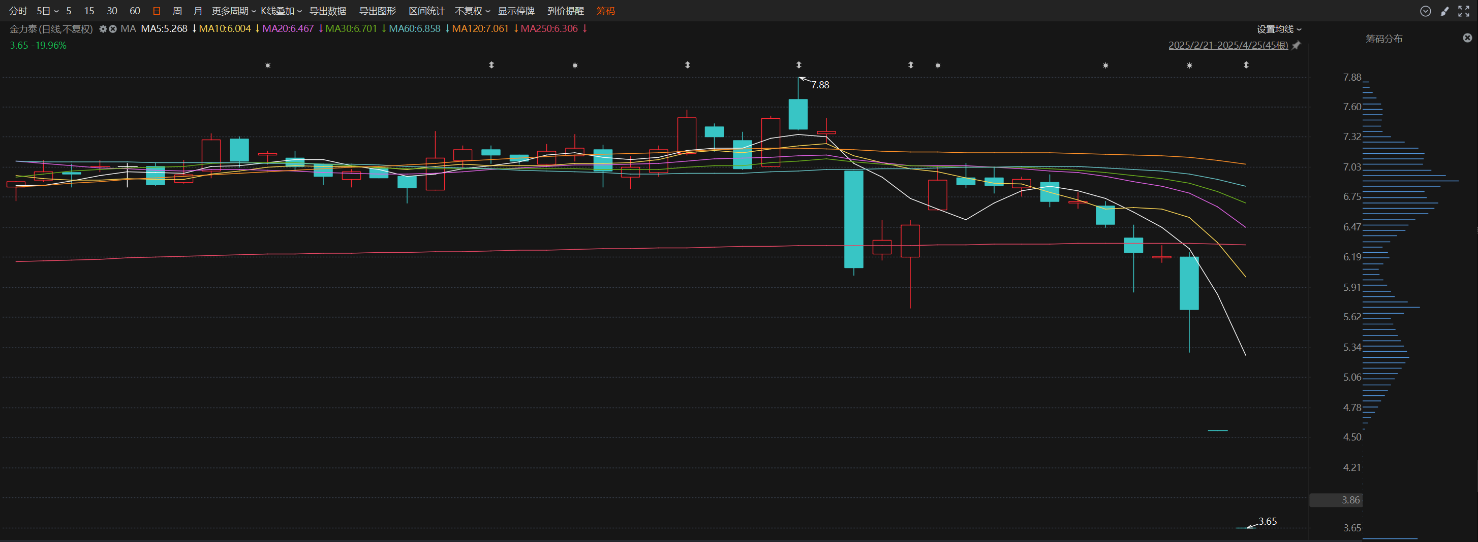 4月24日、25日,金力泰连续2个交易日“20cm”一字跌停。截至4月25日收盘,金力泰报收3.65元/股,总市值17.35亿元。公司股票在近三个交易日内累计下跌了41.13%,市值蒸发超12亿元。