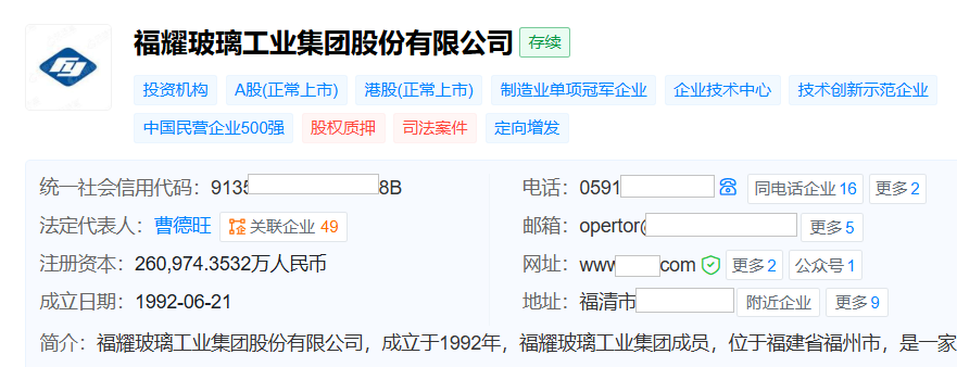 天眼查显示,福耀玻璃成立于1992年,前身是创始人曹德旺于1987年联合股东集资成立的福耀玻璃有限公司。1993年,福耀玻璃在上交所主板上市,成为福建省最早上市的民营企业和中国同行业首家上市公司。2015年,福耀玻璃在港交所上市,形成“A+H”模式。其主营业务是为各种交通运输工具提供安全玻璃和汽车饰件全解决方案,包括汽车级浮法玻璃、汽车玻璃、机车玻璃、行李架、车窗饰件等。