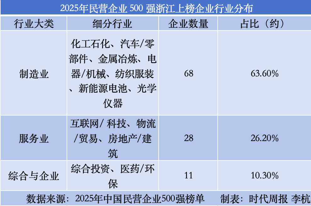 时代周报记者经过梳理发现,2025年浙江共有107家企业上榜,其中制造业企业达到68家,占比为63.6%。