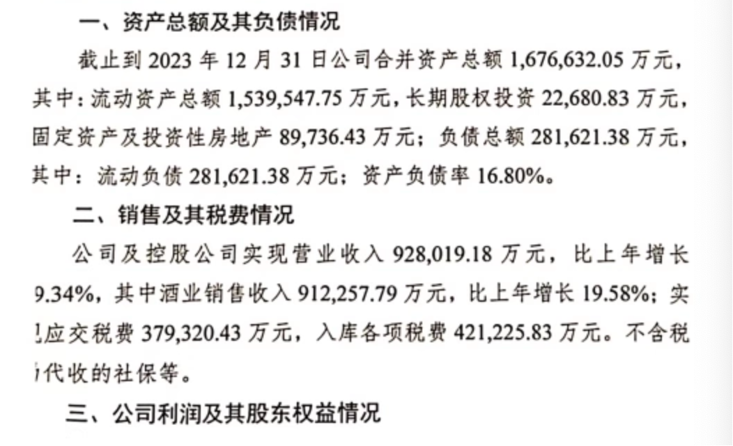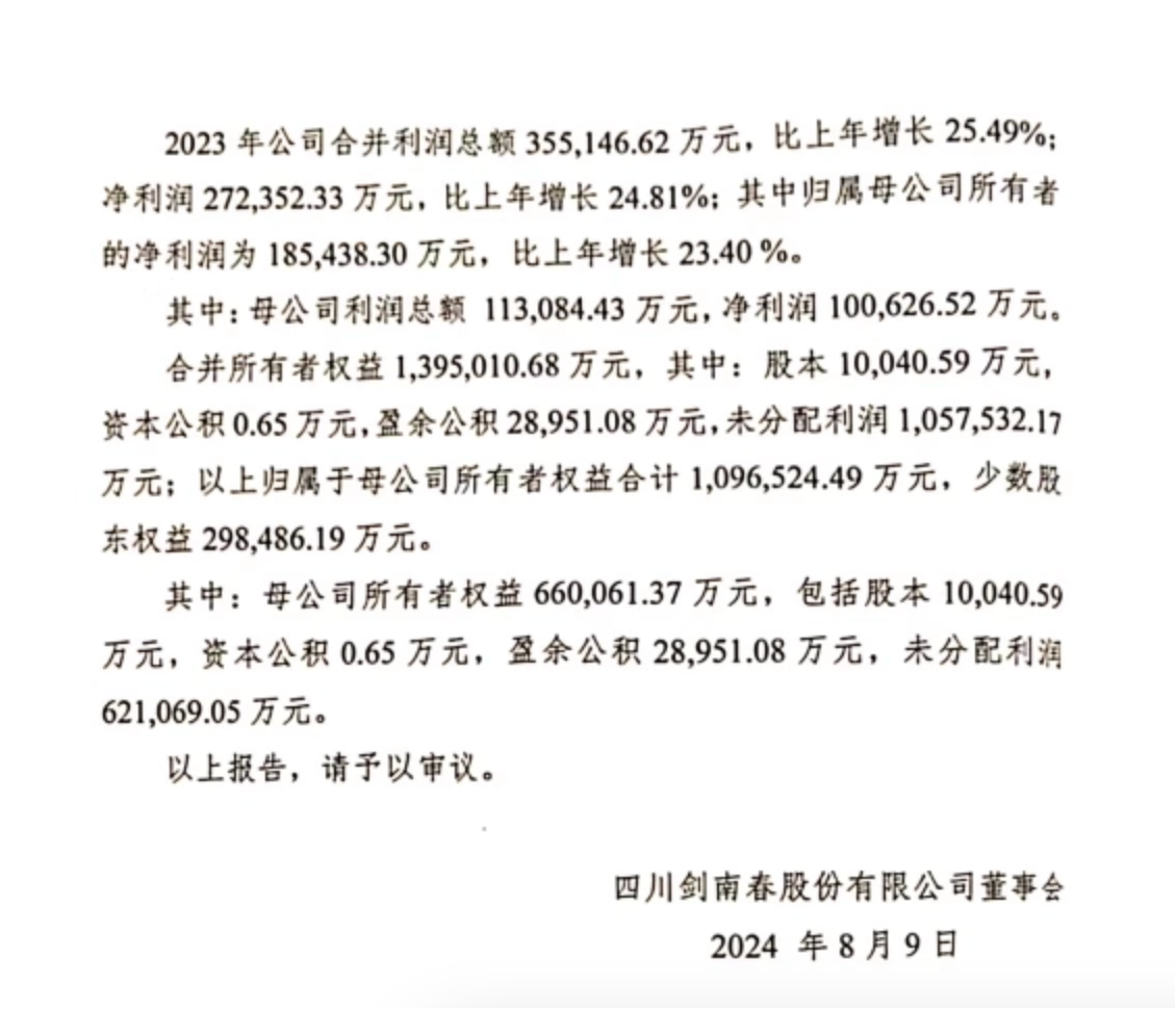 此外,时代周报记者注意到,在阿里拍卖平台上,一则《四川剑南春股份有限公司2023年度财务决算报告》显示,2023年剑南春营收为92.8亿元,比上年增长 9.34%。其中,酒业销售收入91.23亿元,比上年增长19.58%;净利润27.24亿元,比上年增长24.81%,归属母公司所有者的净利润为18.54亿元,比上年增长23.40%。