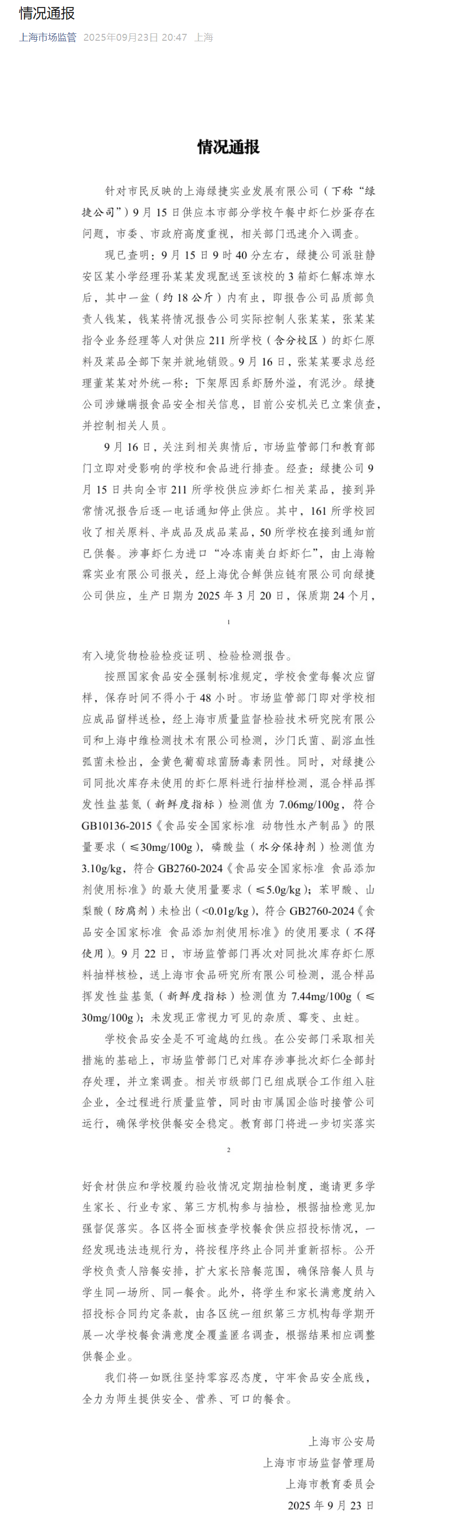 三部门通报“部分学校午餐虾仁炒蛋存在问题”调查情况:绿捷涉嫌瞒报,公安机关已立案侦查
