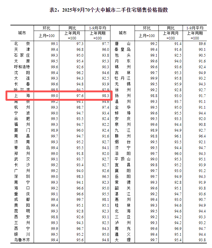 就从城市层面而言,9月份,70个大中城市中,二手住宅价格环比上涨的城市数量为0。其中,上海二手住宅价格环比下降1.0%,降幅与上月持平。这是上海二手住宅价格自今年5月份起环比连续五个月出现下降。