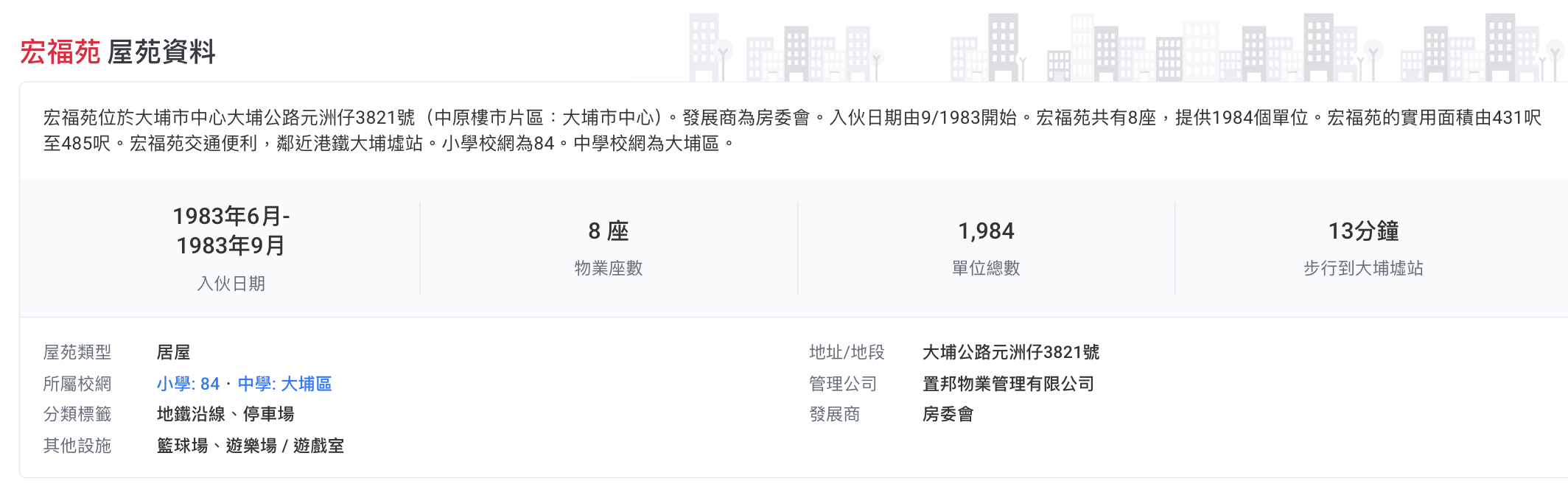 根据香港中原网站,宏福苑位于大埔市中心大埔公路元洲仔3821号。发展商为房委会,管理公司为置邦物业管理有限公司。入伙日期由1983年9月开始。宏福苑共有8座,邻近港铁大埔墟站。