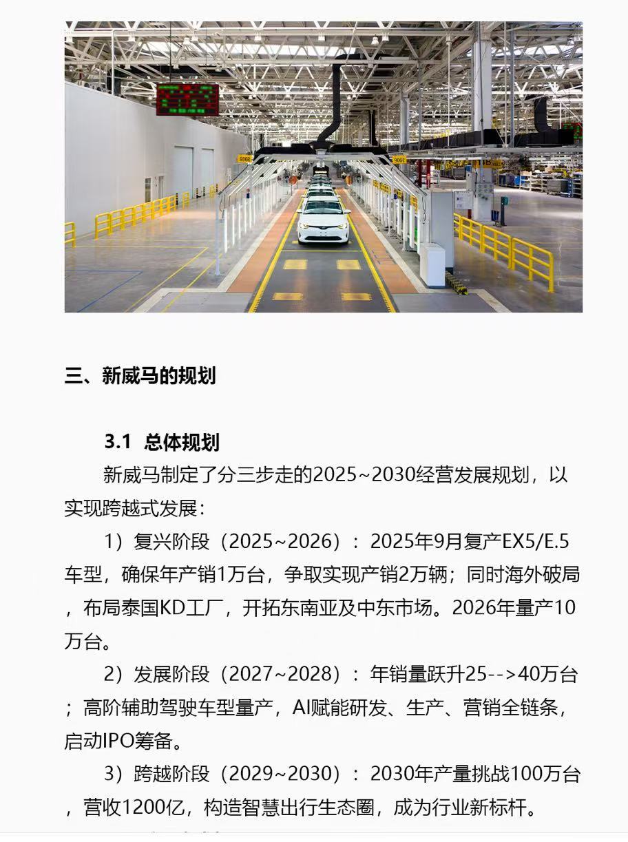 根据威马《白皮书》,其2025年至2026年为复兴阶段,计划在2025年9月复产EX5和E.5车型,年度销售目标为1万台,力争达到2万台,并布局泰国KD工厂,开拓东南亚及中东市场。