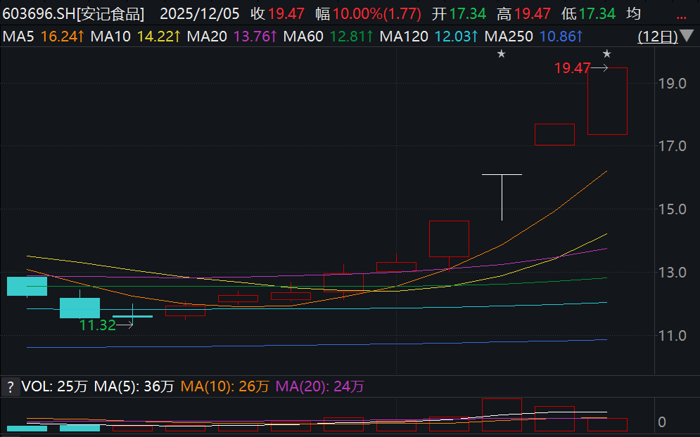 上市近十年后的12月份初,安记食品的股价迎来了一轮爆发式上涨。