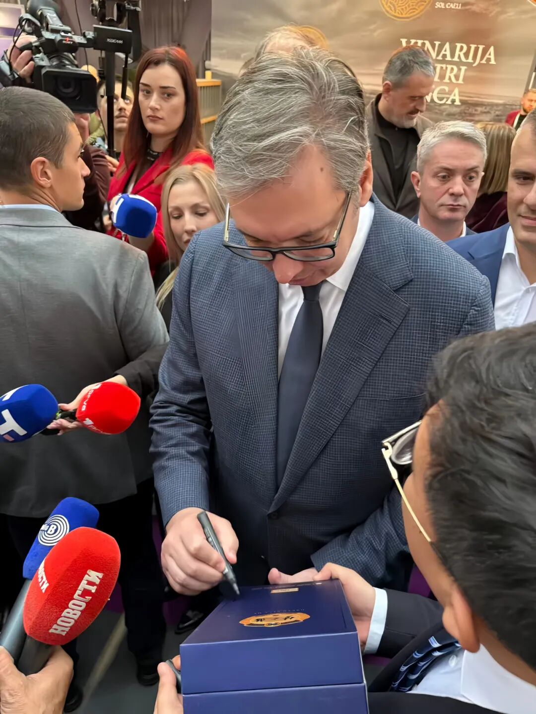 “开放巴尔干”塞尔维亚国际酒类博览会上,塞尔维亚总统武契奇亲临洋河展区,称赞绵柔口感“pretty good”,并欣然留下了亲笔签名